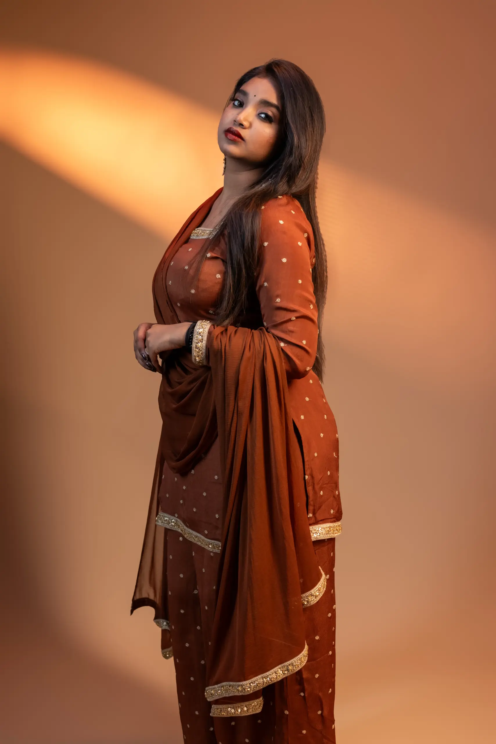 Karnikar Brown – Kurta Set Elegant in its simplicity, the Karnikar Brown Cord Set celebrates refined minimalism through delicate micro floral prints scattered gracefully across a rich brown base. Crafted in lightweight chiffon fabric, the ensemble carries a soft sheen that enhances its understated charm. The subtle floral detailing adds a touch of quiet sophistication, while the clean silhouette keeps the look modern and effortlessly graceful. Paired with a flowing dupatta and thoughtfully finished borders, the set brings together minimal design and timeless elegance. Chic, versatile, and refined, the Karnikar Brown Cord Set is perfect for intimate gatherings, festive evenings, and occasions where subtle detailing makes a lasting impression.