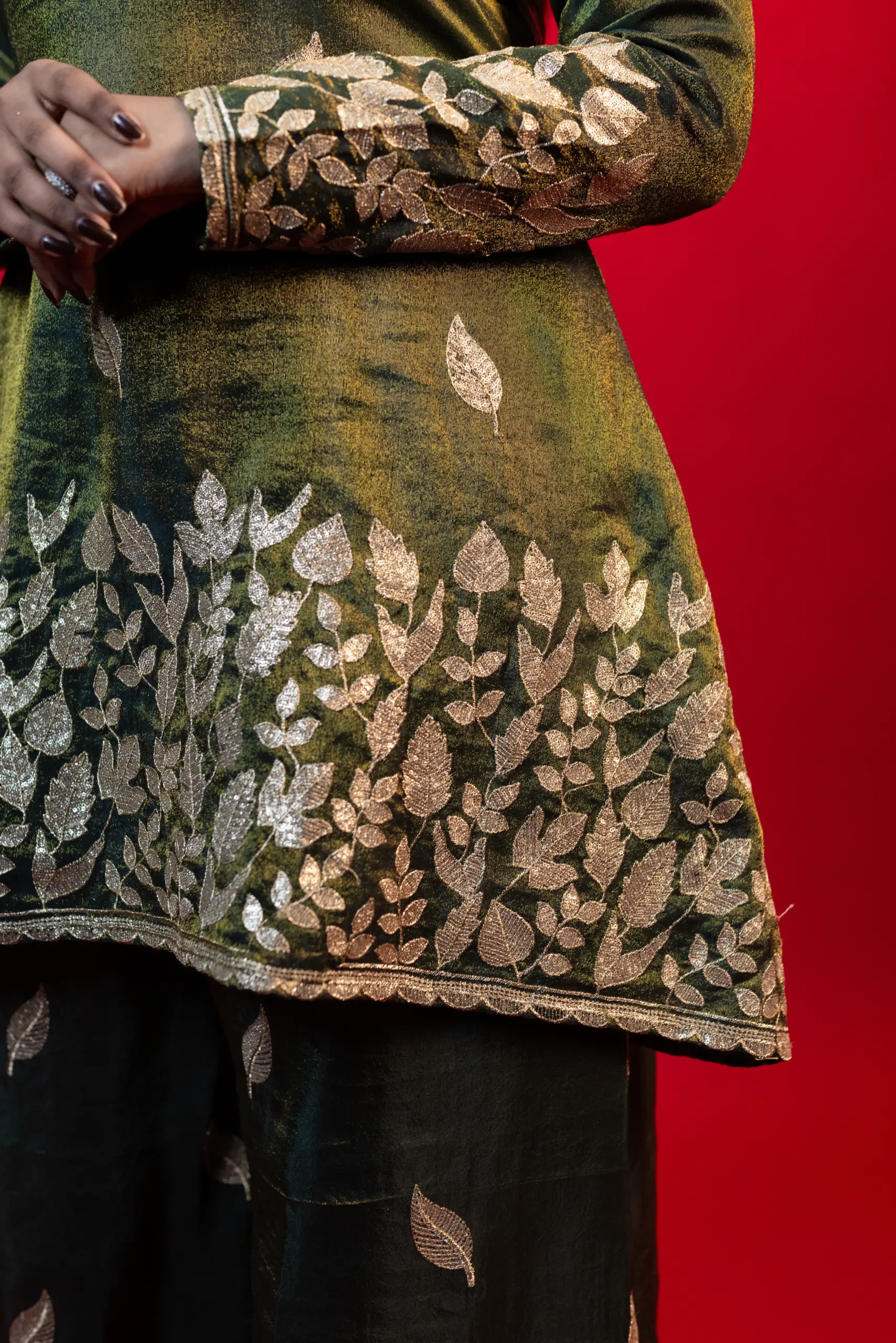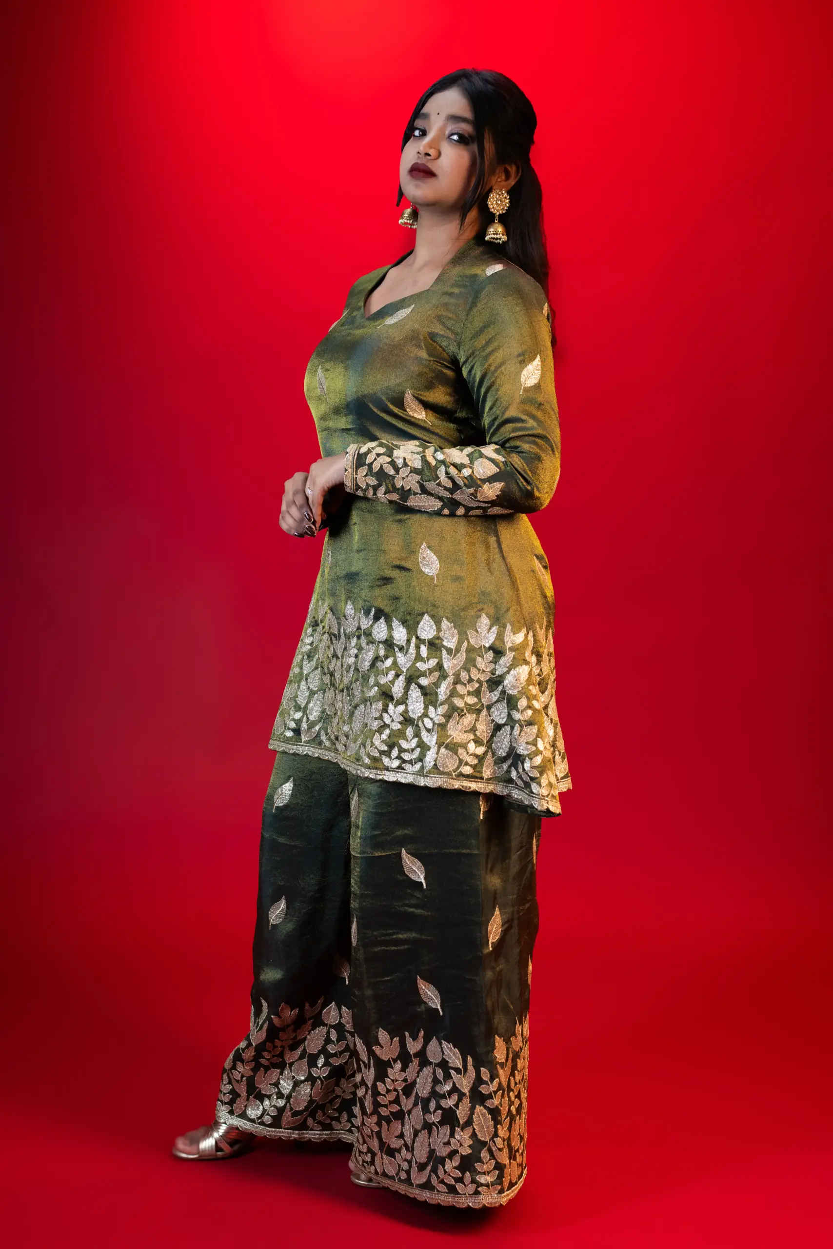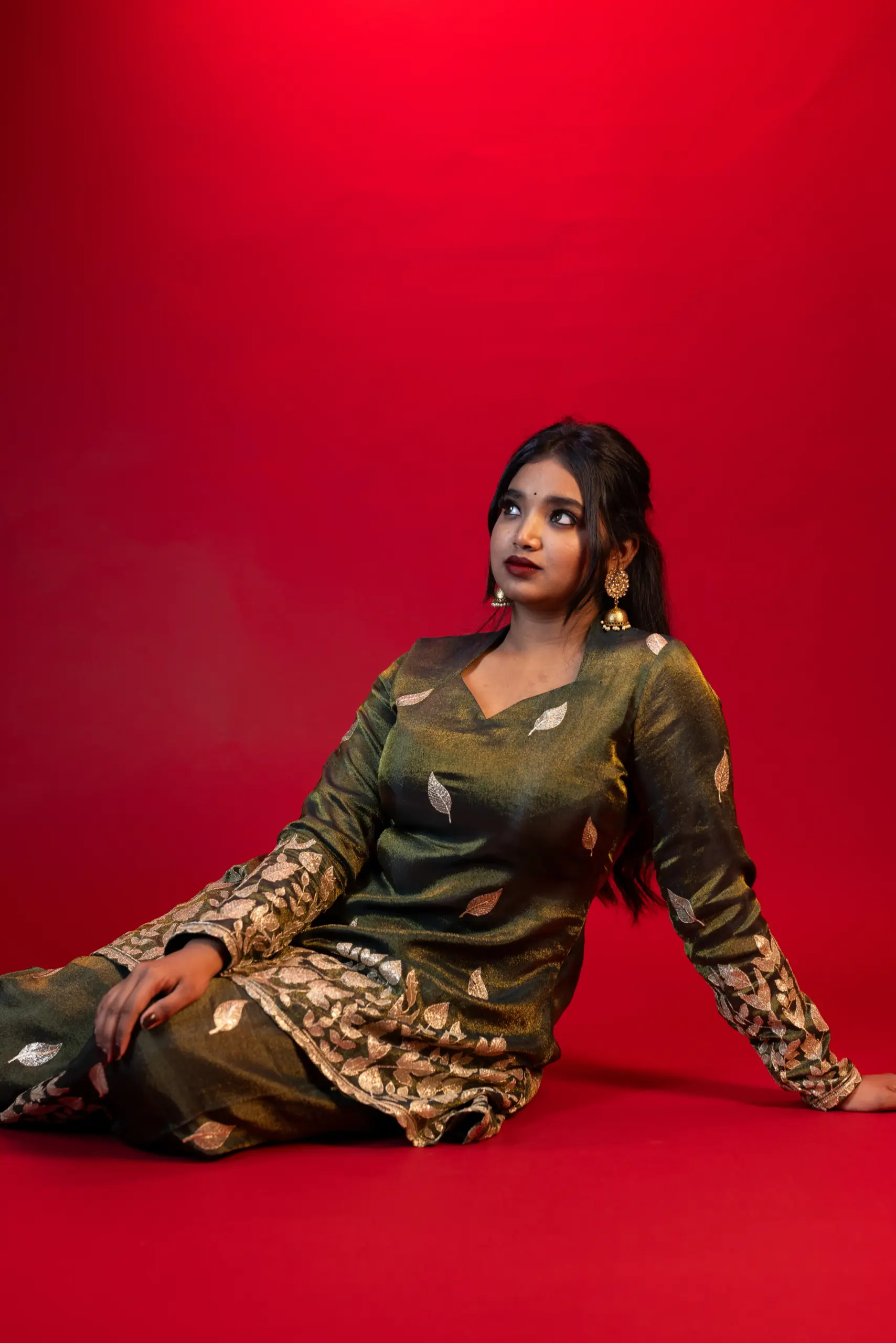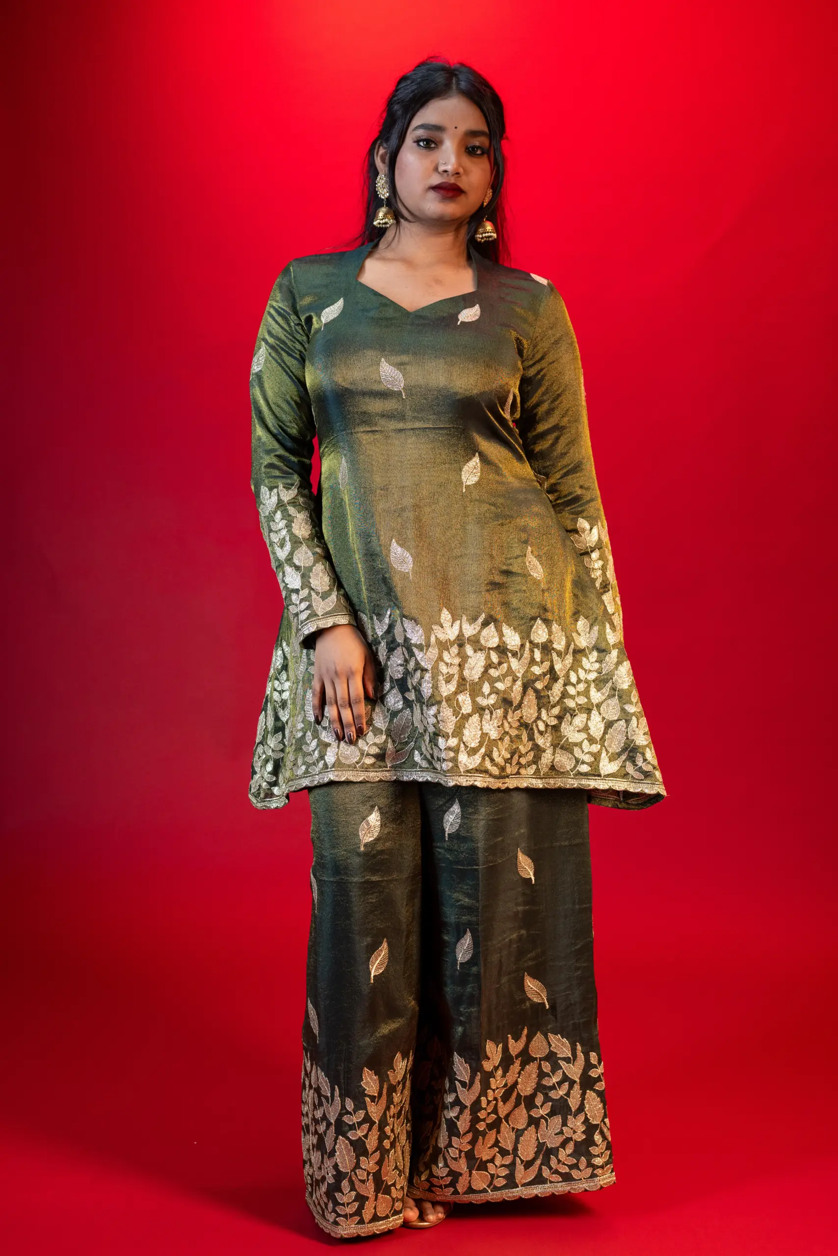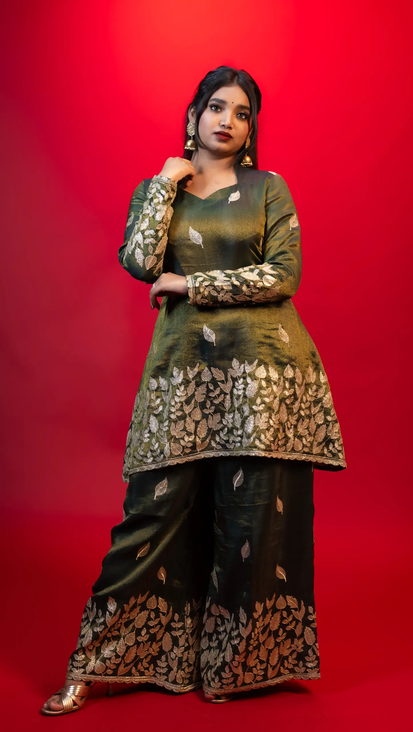 Kumuda Mehndi Green – Tropical Cord Set Rich, earthy, and effortlessly elegant, the Kumuda Mehndi Green Cord Set is inspired by the vibrant beauty of tropical landscapes. Crafted in luminous tissue fabric, the ensemble features bright tropical and foliage prints that bring life and movement to the deep mehndi green base. Intricate premium floral embroidery along the hem and sleeves adds a touch of artisanal richness, creating a striking contrast against the luminous fabric. The thoughtfully placed motifs and detailed borders celebrate nature’s abundance while maintaining a refined and contemporary silhouette. Lightweight yet luxurious, the Kumuda Mehndi Green Cord Set blends traditional craftsmanship with modern elegance—perfect for festive gatherings, daytime celebrations, and statement occasions.