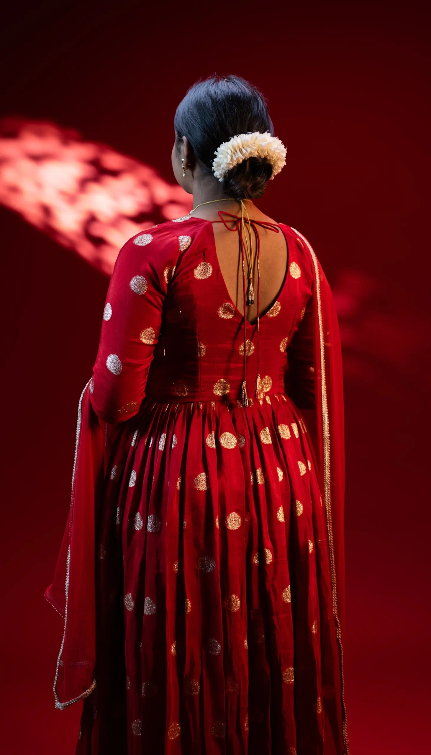Mandara Anarkali Set – Red & Beige Elegant and timeless, the Mandara Anarkali Set features a graceful red Anarkali adorned with micro-minimal floral prints, creating a refined and sophisticated look. Crafted from luxurious raw silk, crepe, and brocade fabrics, the ensemble offers rich texture and fluid movement, perfect for festive occasions and celebrations. The flowing Anarkali is paired with classic beige pants, adding a subtle contrast that balances the vibrant red hue beautifully. Designed to blend traditional craftsmanship with modern minimal aesthetics, the Mandara Anarkali Set brings effortless elegance to any special occasion.